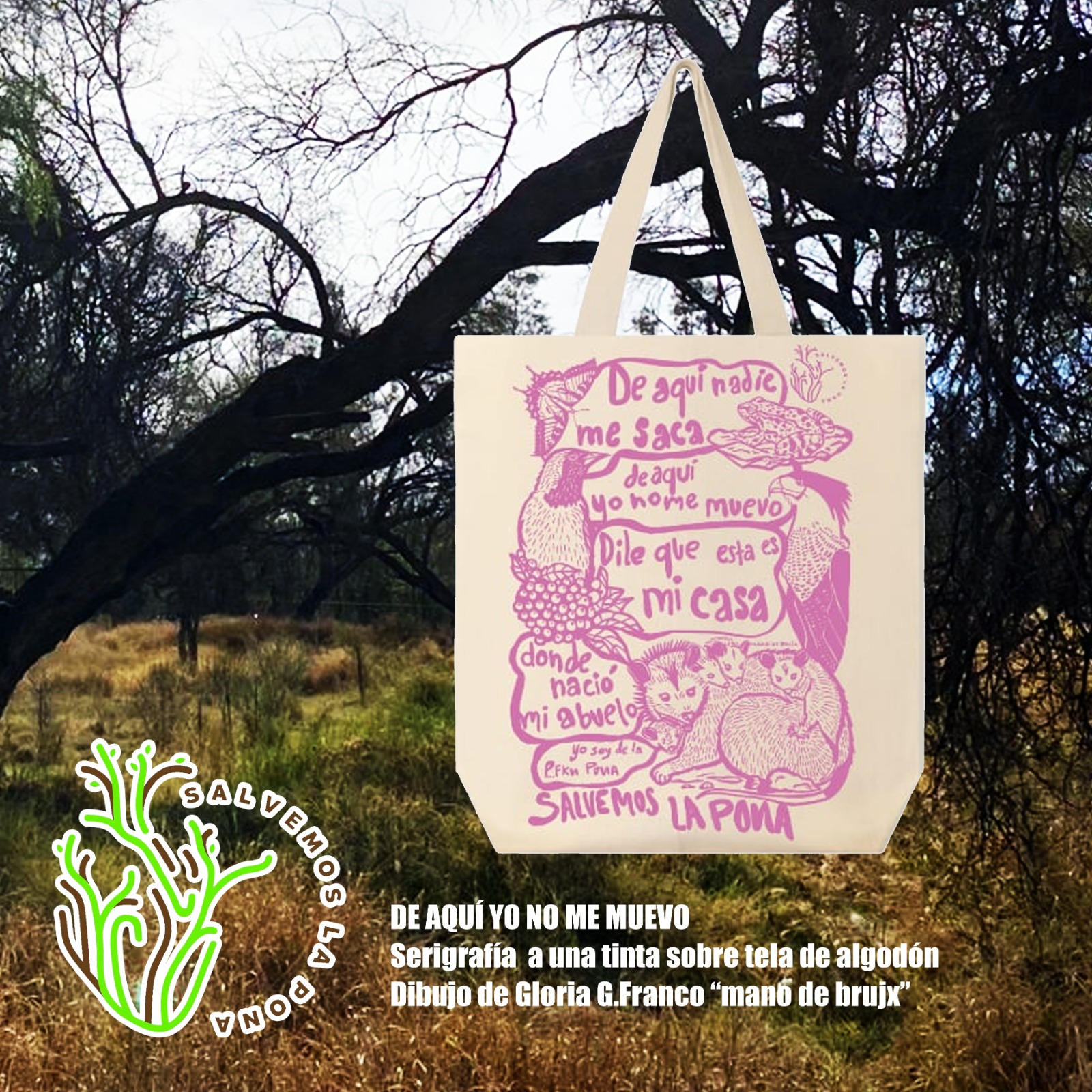 Este diseño contiene un texto gráfico que articula memoria, pertenencia y defensa territorial: «Dile que esta es mi casa, donde nació mi abuelo. Yo soy de la Pona.»
